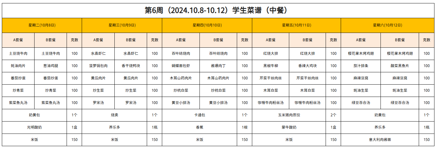 第6周(2024.10.8-10.12)学生菜谱(中餐)