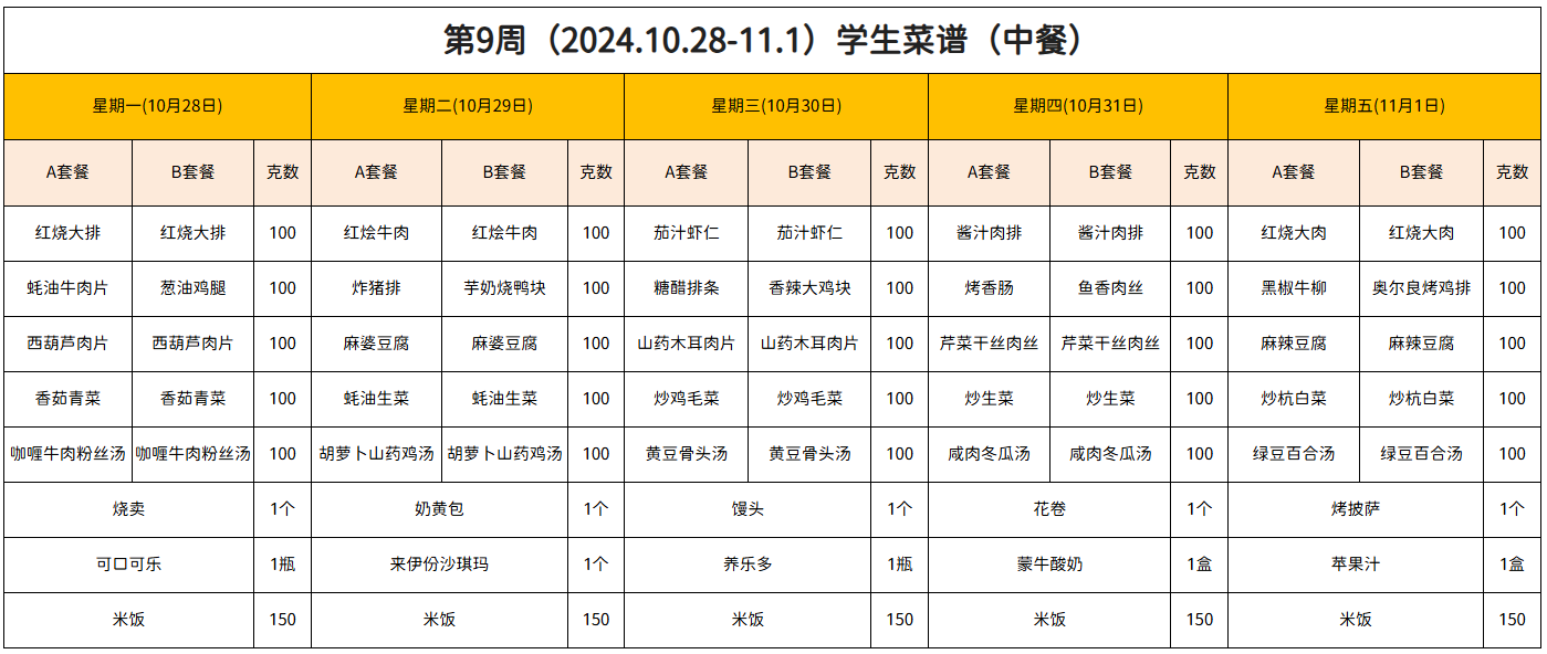 第9周(2024.10.28-11.1)学生菜谱(中餐)