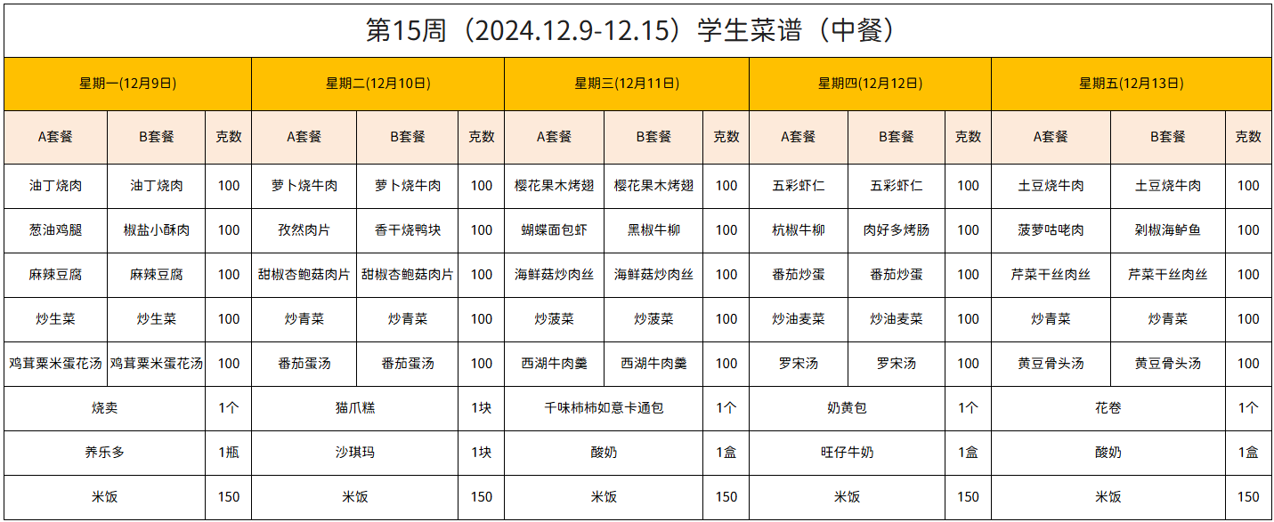 第15周(2024.12.9-12.15)学生菜谱(中餐)
